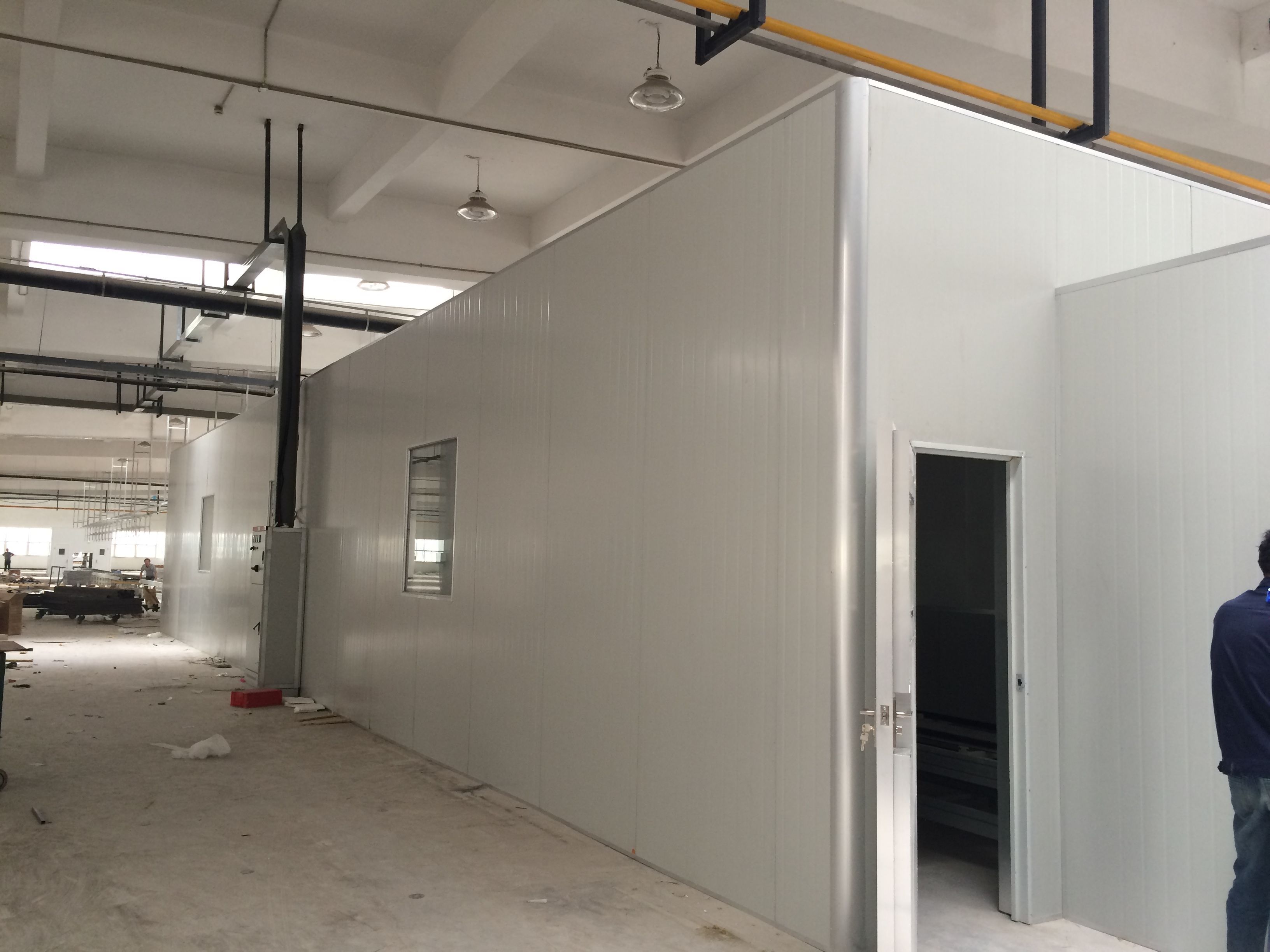 一、选用≠75mm彩钢夹心板制作墙体,所有门均采用≠50mm彩钢夹心板制作。所有彩钢夹心板均采用阻燃型。